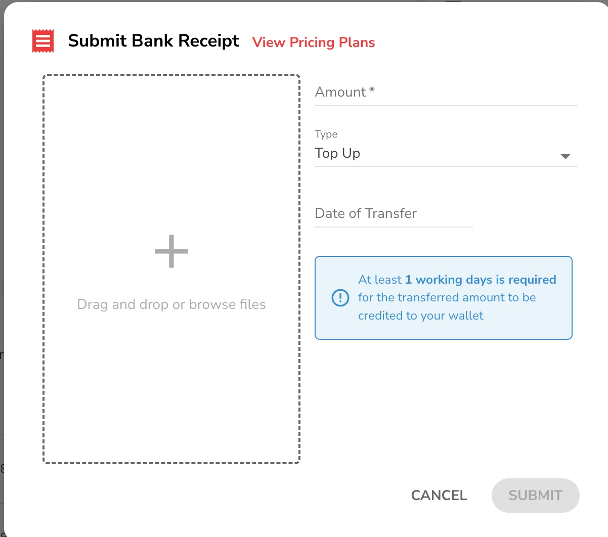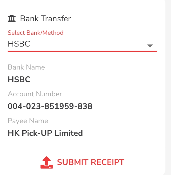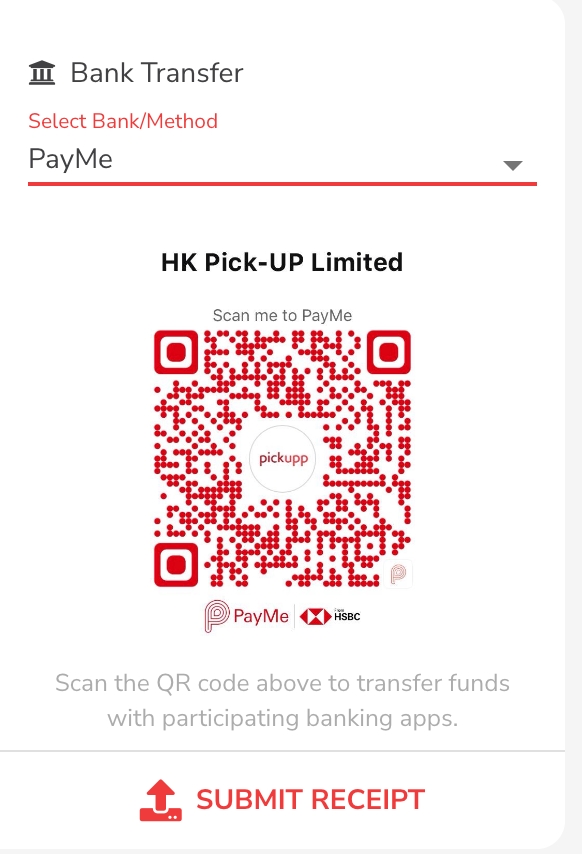 - If you choose the bank transfer method, please upload the successful transfer screen, transfer amount, and transfer date. The Pickupp team will verify the transfer information within 1 business day and credit the amount to your e-wallet.