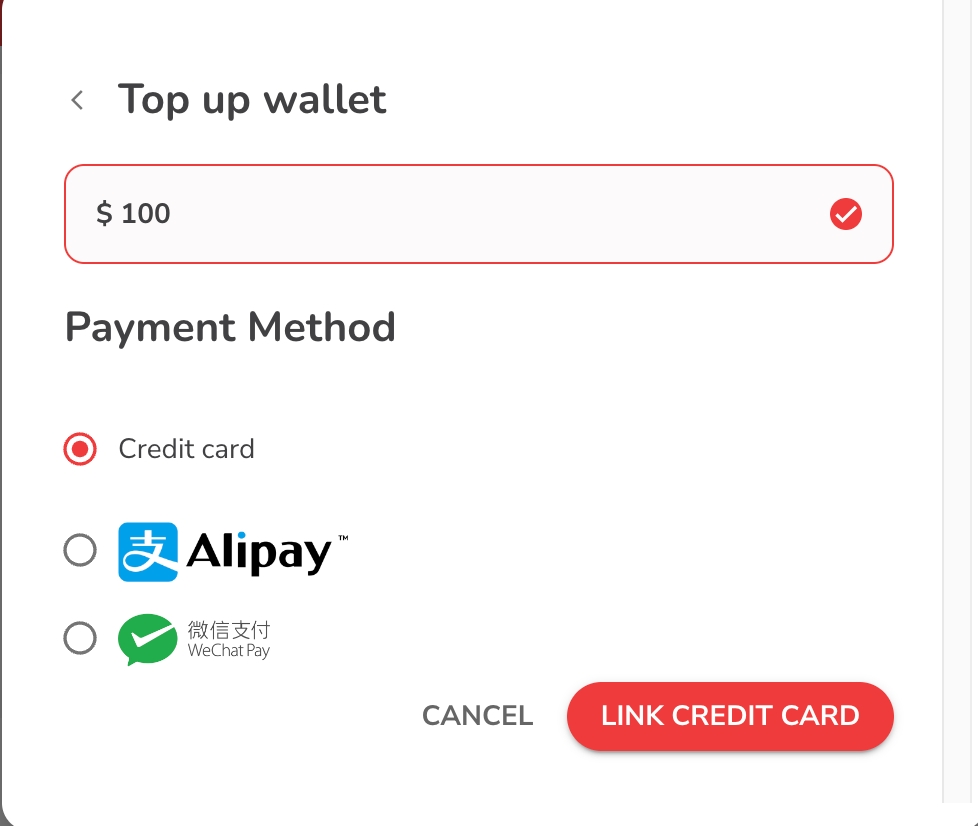 - After selecting the amount, system will display the available payment methods, supported payment methods include AliPay, WeChat Pay and credit card linking.