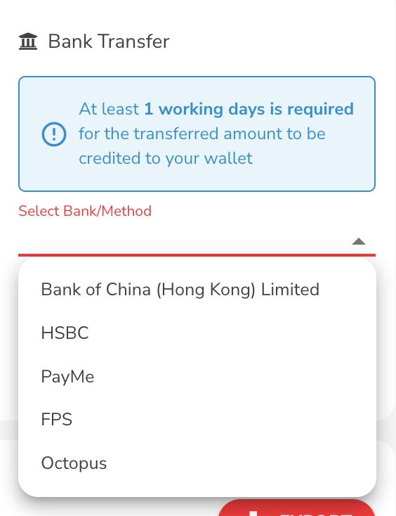 - Click on the "Bank Transfer" "Select Bank/Method" option, and the system will prompt a window for Bank Transfer